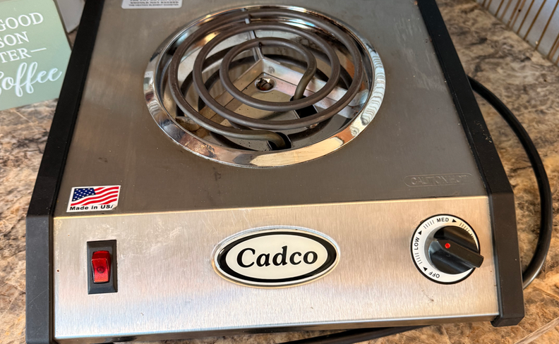 This unit has no built-in cooktop to allow for more counter space, with a portable burner and additional pull-out counter space included for flexibility